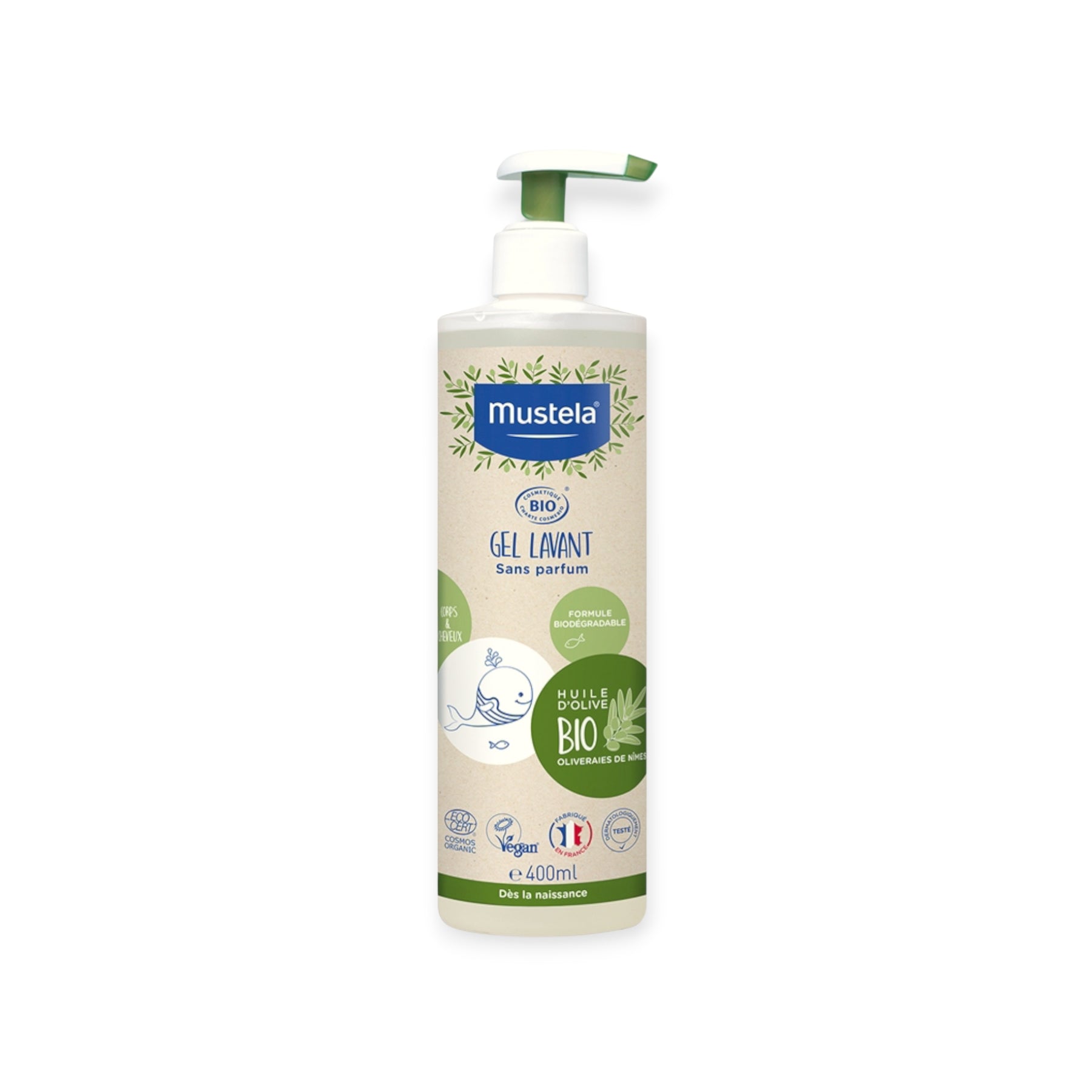 Mustela Gel Lavant Famille BIO – Corps & Cheveux – Huile d’Olive Bio – Sans Parfum – 400 ml